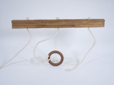 Three ropes suspended from a bar of wood one has a ring tied at its end. The ring jumps from one end rope to the opposite end rope when passed behind the back of the magician. No great mystery here. When the ring jumps to the center rope then you have magic. Includes instructions. Condition fine. | |