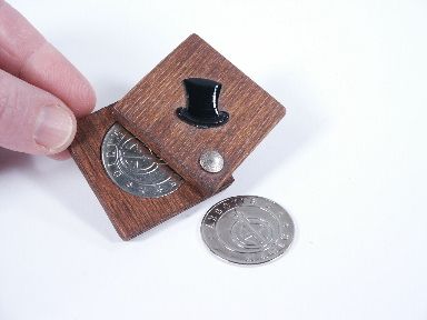 By Guaranteed Magic this small wood box will allow for the vanish and reappearance of a half dollar size coin. Includes 2 Abbott Token coins and instructions. Condition very fine.