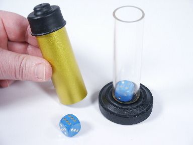 A die placed in a clear tube resting in a wood stand is shown and filled with water. The die of course remains at the bottom of the tube submerged in water. A gold cover is placed over the clear tube followed by a top. The top is removed then the gold tube and it is seen that the die has vanished! As desired the die may be reproduced. Includes instructions. Condition very fine. | |