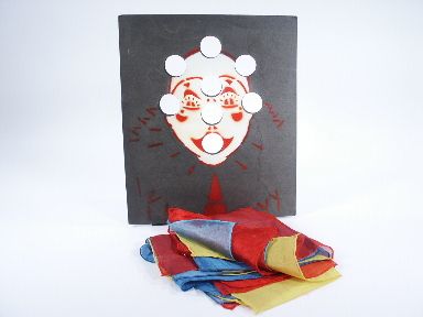 An old and original Ed Massey effect where the magician shows a clown face that is hinged to another section. The face section is let down to show the other plain section and both have 8 matching openings. A piece of paper is laid upon the plain board and the clown face board brought up against it. The paper covered openings are now punched and silks produced from each opening and all this from 2 boards shown fairly moments before. Some moisture marking not affecting working. Includes illustrated instructions and 8 silks for the production. | |