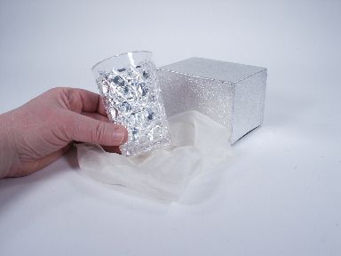 A cut crystal tumbler (plastic) is shown and milk poured in. Tumbler turned over and a dry silk pulled from within! This has impact. Includes instructions and in like new condition.