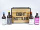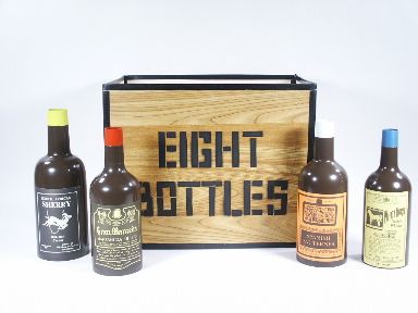 A wood grain folding screen showing the lettering saying Eight Bottles is seen upon the table. The magician removes a bottle from within showing it and decides this is not the one he is looking for. The bottle is replaced and another different one is removed. Same as before this one is not to his liking and it too is replaced.