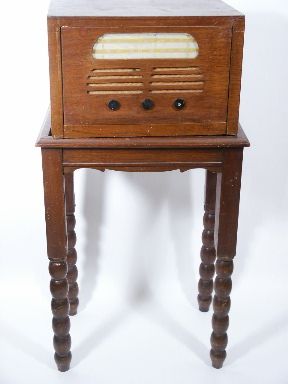 This early piece stands nearly 34" high with Radio Cabinet upon the tabletop with a table width of 19" and depth of 13 1/2". Includes red and black velvet cover for lifting away the radio for its eventual vanish. The turned portion of the four legs twist away for travel and transport.