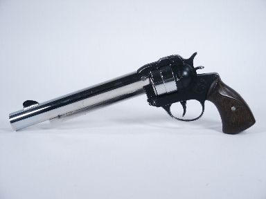 From Sweden 1992 using a toy pistol from Spain Mr. Duco has fashioned a unit that will vanish a silk (not included) or card tucked into the end of the barrel at the same time having a loud report. Instructions are given for the simple replacement of elastic band that will need to be done. The plastic grips show signs of break and repair otherwise good condition. Includes illustrated instructions. | |