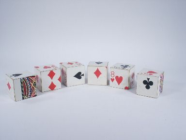 Six blocks approximately 2 1/4" square each having a different card piece showing on its six sides. The blocks are stacked in a jumbled condition and covered with a handkerchief (not supplied).