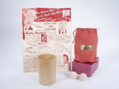 Before you is the Holy Grail of Chop Cups as this one was produced by Chop Chop Al Wheatley and comes in a bag with Chop Chops Exacto Magic of Hollywood label including box balls and illustrated instructions. What also makes this special is the inclusion of a 1957 promo showing illustrations of Chop Chop with Charlene. All in very fine condition and I cannot stress enough how difficult it is to come across this piece. Don't pass this one by. | |