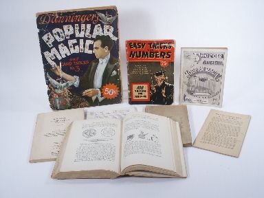 *Dunninger's Popular Magic and Card Tricks Number 3 96 pages. *Blackstone's Modern Card Tricks and Secrets Of Magic 467 pages. *Magic For Home and Stage Shrewesbury Publishing Chicago 150 pages. *Fifteen Minutes With A Piece Of Rope Ralph Hull 36 pages. *50 Pages Of Dove Work. *Routined Manipulation Part 1 Lewis Ganson 118 pages. *Secrets Of Ancient And Modern Magic Wehman Bros New York 94 pages. *Easy Tricks With Numbers 108 Tricks For Ages 9 - 90 Joseph Brown 48 pages. Many without covers. Condition fair. | |