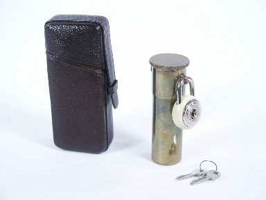 This is a double wall bill tube in brass along with padlock and carry case. This tube is 2 9/16" long. From the Ray Ellenbogen collection.
