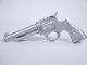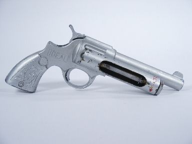 Using a cap pistol made entirely of metal this has a special wind up barrel with a smooth bar type clip that fastens in place over the body of a silk laid across the pistol and when the trigger is squeezed it sets in motion the mechanism which quickly winds in the silk causing it to visibly vanish! Silk not supplied. This will make a fine addition to a collection and this one in really fine working condition. Scarce and desirable. | |
