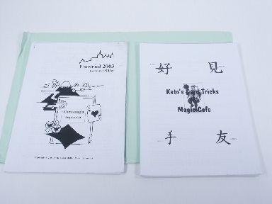 Within folder with signature of Jerry Andrus Cartomagia Japonesa by Reinhard Muller 34 pages with illustrations and Kato's Card Tricks in Magic Cafe 2003 Hideo Kato having 170 tricks within group of unnumbered pages. The late Jerry Andrus was known as a magician's magician. A rare individual possessed of many talents creating magical effects and optical illusions enjoyed around the world. This auction listing is from the personal effects of Mr. Andrus. | |