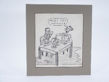 Image is of magician at dinner table with cards in hand and book propped up and woman has caption of "Must You Henry!" This is original drawing and signed by Jerry Andrus. Measures 11" x 12" in mat. Light soil. The late Jerry Andrus was known as a magician's magician. A rare individual possessed of many talents creating magical effects and optical illusions enjoyed around the world. This auction listing is from the personal effects of Mr. Andrus. | |