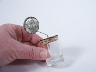 With credit to Peter Kayne and routine by Roy Johnson. London. The magician displays a coin for a moment and a handkerchief (not supplied) is thrown over it. The free hand takes hold of the coin through the cloth and the magician after showing his hand empty goes under the handkerchief and out from the handkerchief the magician withdraws a glass of beverage! This is now presented to the spectator. Includes 3 pages of instructions which include additional information about Caravelle. Condition very fine. | |