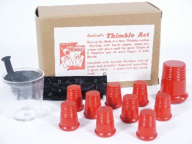 All thimbles are of turned wood and this includes 9 standard size thimbles and 1 jumbo thimble. Also included is the small glass with rubber cover and one holder for thimbles. Includes 6 pages of illustrated instructions. Condition very fine.