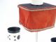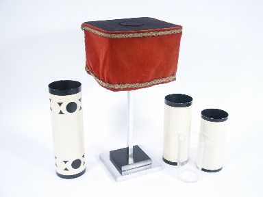 A scarce hard to find item involving a miniature table with drape along with a glass and three decorated tubes. The magician shows a glass and places it upon the miniature table that stands 13 1/2" high. The glass is covered with first a smaller tube and then a little taller tube and finally the tallest tube of all.
