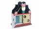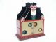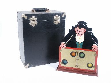 Built around the effect named Bloxo this cabinet contains four blocks of different colors that when placed vertically within and doors closed the blocks are in view through round openings in the doors. Both the front and rear side of the cabinet match with exception of the doors and the doors on one side are in Gold and on the other side are in Silver. This beautiful piece stands 12" high and base is 10" wide x 5 3/8" deep. Built of wood and well painted design of a Magician wielding a wand and a handle between the two Magician figures for effectively holding the cabinet. The doors front and rear are hinged to the cabinet and closure is by hook and peg fasteners. On the sides of the cabinet you will find two horizontal slots that would accommodate two long narrow blades (not supplied) which serve the purpose of holding all four blocks securely in place as the blocks also have matching slot openings. This entire unit is contained within a wood carry case. The effect is of the free selection of two of the color blocks followed by the placement of all four blocks within the cabinet and then securely held in place with the two long blades. With blades in full view extending beyond the side walls of cabinet the Magician is able to open the rear doors and remove the two selected blocks and after setting these aside the front doors are opened showing the two remaining blocks still firmly held in place by the blades. Circa 1930's and the only one this Collector has ever seen. Condition very fine and desirable. | |