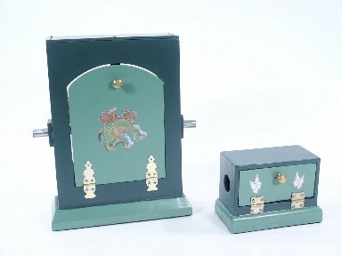 Three silks tied to a horizontal bar within a frame that stands 10" high are removed and placed in a small cabinet. The door to the frame is closed and the magician lowers the doors on the small cabinet showing the silks have vanished! Setting the small cabinet aside the door to the frame is let down and the silks have magically reappeared tied to the horizontal bar! Includes all silks and instructions. Condition very fine. | |