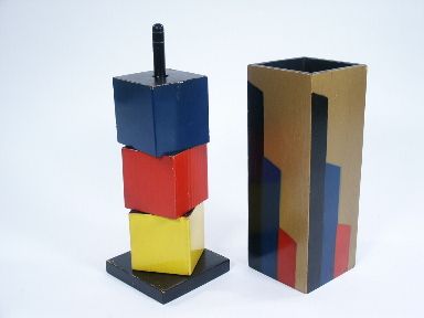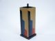 Going a step further the magician takes the blue block replacing it on the rod with the statement that he will now cause it to travel invisibly. A wood tube lacquered in colors of a modernistic design is placed over the 3 blocks. With a magical gesture the tube is lifted away showing its emptiness and now there are only 2 blocks remaining on the rod! Reaching into the hat or paper sack the magician brings forth the traveling block!