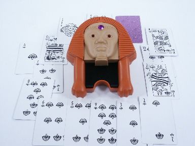 Electronic Talking Magic Works, Milton Bradley, 1995, in original box. You introduce the Sphinx to your spectator, explaining that it has taught you all its secret powers. To prove it, you fan out the deck of Pharaoh cards. Your spectator draws a card, secretly looks at it, then returns it to the deck. You slide the deck of cards into the Sphinx and remove them one by one. Before pulling out each card, you predict it is the wrong one, then press the jewel on the Sphinx's forehead to hear it speak. For each card, the Sphinx verifies your prediction by saying no. Suddenly, you tell your audience you have a strange feeling the next card you draw is your spectator's. You make your prediction, then press the jewel. The Sphinx says, "Yes! This is the card!" You show the card to your spectator. It is the chosen card!