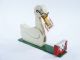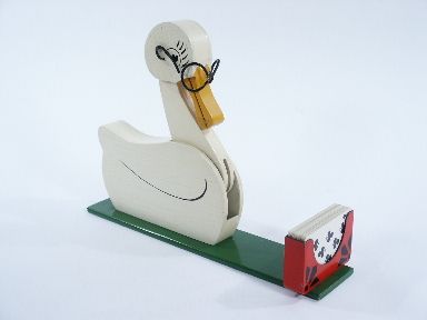 | From the earliest days of Mr. Hamilton's manufacture, this one having a feed box houlette made of metal. This Jo Anne Duck is fitted with eyeglasses (which are removable as they are hooked over two little nail heads) in order to better find the right cards. The age of this piece shows in the checkering of the paint finish and this was a favorite of Mr. Bob Dowd to perform with.
