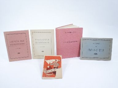 1 soft bound book and 4 soft covers, all in Spanish. 1. Arte De Encantamiento, F. Javier Barcon, S.J., 1945, cloth bound, 457 pages, illustrated. Light and Heavy Chest, Levitation, Black Art with Skeleton to Decapitate Magician's Head and much more. Condition cover light bumps. Condition fine. 2. Ilusionismo, Barcelona Spain, Eduardo Wiederkehr, 31 pages. Condition cover loose with 1 1/2" x 3" piece absent along with chipping, back part of cover absent, top edges not yet trimmed. 3. Ciencia Del Ilusionismo, Por Magus, Circa 1950, 18 pages with index. Condition very fine. 4. Filosofia Ilusionista, Por Magus, Circa 1950, 24 pages with Index. Condition very fine. 5. El Libro De Magus, 15 pages, illustrations. Condition rear cover half torn away otherwise condition fine. | |