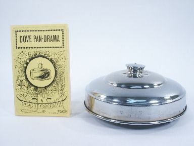 This steel dove pan has a diameter of 9 1/2" having air holes for livestock punched in the lid near the handle and made with a deceptive tier design. The pan does not set flat on the surface of a table but rather on three ball shape feet. The handle of the lid is pushed in a little and pan is in used condition, however it works very well and still has plenty of life as a prop to use with condition being good used. Also included is the Bruce Posgate Book entitled "Dove Pan-Orama" having 48 pages and illustrated giving many ideas for use. The book is soft bound and from 1972. Condition fine. | |