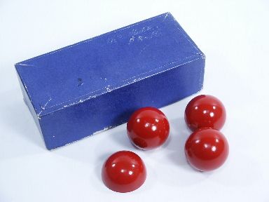 In the original box this set with three solid balls and one shell in very fine condition and 1 1/2" size. After this many years, if you find a set they usually have wear and chips from use. Includes instructions. Condition very fine.