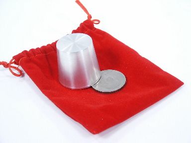 A half dollar passes back and forth between the pants pocket and the cup and then actually shrinks in size and value to a dime! Includes 12 pages of illustrated instructions including Al Cohen routine from 1994. Includes drawstring carry bag which also doubles as a performance pad for the cup. Condition very fine.