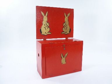 This may be used for livestock or any other solid objects you wish to vanish. Once item to be vanished is placed in the cabinet the lid is closed with hook engaged. Taking the cabinet between the hands the bottom door is seen to fall open followed by the cabinet rotating forward allowing the other door to open for a shocking surprise to the audience of seeing the empty frame work showing the absolute vanish! Cabinet measures 12" wide x 9" deep x 5 1/2" high having rabbit images stencil painted in gold and black. Includes instructions. Condition good used. | |