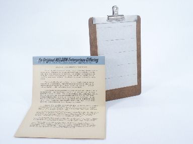 Nelson's Clip Board allows the performer to have access of information written down by spectators even though the information written down is removed and retained by the spectators. Includes Nelson's 12 page manuscript for use. Condition very fine.
