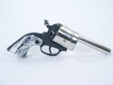 After draping a silk over the barrel of this revolver style pistol it vanishes in an instant. The mechanism is a wind up drum held fastened in the tension position until the trigger is pulled to fire the plastic style caps (not included). The loop for holding the elastic or cord whatever your desire to use has a solder build up showing this has been repaired at one time. Includes instructions. Condition good used.