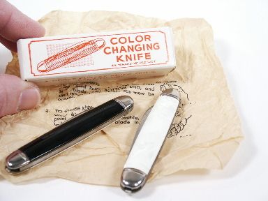 These are still in the original wrappers and in the box. Beautiful Mother of Pearl and Black handle combination for a vivid contrast color change. Both knives have the added feature of the won't open won't close gimmick for use in irritating a spectator. A beautiful set found in like new condition from 1960's. | |