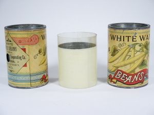 Each can is specially made with a very thin double wall to which a special metal sleeve covered with celluloid and finished to look as a full glass of milk will fit within. Each can has a 5/8" opening at rear to allow for pressure grip of fake milk insert to hold in the double wall. Love the labels that state 'White Wax Beans'. Condition very good.