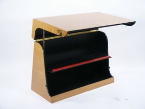 When open the top serves as a light duty surface upon which to perform. A couple of screws have stripped out of the piano hinge and are present. Made of wood with light finish and has a removable shelf. Condition good used.