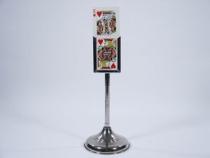 A truly beautiful effect and carried out by the mechanics within this lovely piece. This includes an early deck of Steamboat Playing Cards that are regular for display. If wishing to make this deck special for use with the stand there are instructions and a template for doing so. Includes Ultra Card Rising Stands instructions. This hard to find item in very good condition and is hallmark stamped with the large P&L Logo.