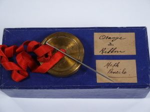 This effect may be found in Professor Hoffmann's book entitled Later Magic. The effect is of an orange selected from a plate of several by a member of the audience. After it is passed around for examination and everyone is satisfied it is unprepared the magician produces yards and yards of silk ribbon until he has quite a quantity. The orange may be given to the audience to be cut to prove that it is unprepared. This is in the original box which curious enough has a second label affixed which reads Meph Pencils (Mephisto Pencils) which in itself is a curiosity. This is a difficult item for the P&L Collector to find. Includes instructions. Condition very fine. | |