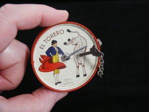 Franco patented trick novelty where the Matador is able to pass his sword through the bull's neck in a seemingly impossible solid through solid penetration. The action is positive and works well. Condition very good.