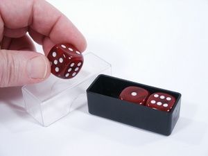 A beautiful rendering of a trick that is a particular favorite of mine. Made in Western Germany with beautiful marble style dice. The box contains only three dice as clearly seen with the transparent lid. One is removed and placed in the pocket. With the lid back in place the box is turned over showing no way could the magician sneak something back in, however the box when turned upright again is seen to have the three dice in view! So smooth working and an effect worth doing. Includes instructions in English. Condition very fine. | |