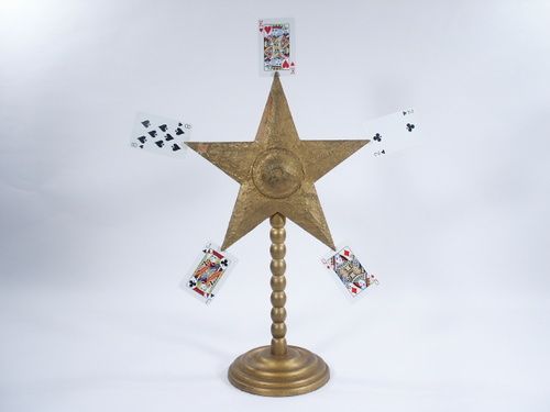 Another very elusive Thayer Rarity now available to you for your collection. This one standing 19" high all in wood with heavy base for stability. Gesso absence that may be redone if desired. The star may be activated to produce playing cards at each point by merely a pull of a thread. A centerpiece for a Thayer Collection. Condition very good. | |