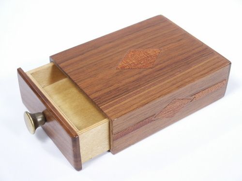 Mr. Miller has been out of production for several years and it is unlikely that items will be made again. Don't miss this opportunity to acquire this handmade item. This is Number 1 dated 1990. This beautiful smooth finished Walnut Drawer Box with wood overlays may at first be shown empty even to the point of completely removing the drawer from the box. Once the drawer is replaced the magician is able to cause an entire deck of Poker size cards in its own box to appear within! This is not your ordinary style of Drawer Box and as usual to be expected from Clarence Miller has its own unique twist in operation. This is a signed piece. You will supply your own deck of cards as they are genuine. Includes instructions. A so tiny nick on the bottom long edge otherwise very fine. | |