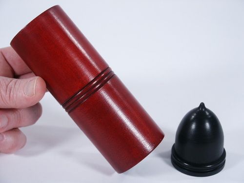 Tube measures 5" in length having a diameter of 1 7/8" all being of turned wood with luxurious deep cherry finish. Both ends of tube are turned ledge openings so as to receive the bullet load from either end. The beautiful turned wood bullet load is so nice with a special turned groove which holds tightly the elastic band holding the tissue drum head in place. This was a slightly less expensive version sold without the black retaining rings therefore tissue squares were placed over each end and held in place with elastic bands. In truly very fine condition. | |