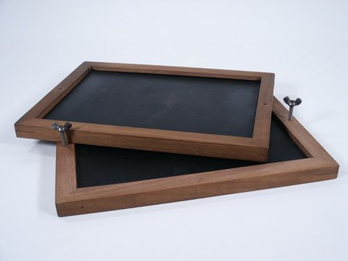 This is a very special mechanical set of slates which may be examined. When slates are placed together and secured with bolts and wing nuts the performer may take slates in hand and with little effort be able to glimpse at what is written on inside slate surface. Other methods of use will come to mind for this diabolical set of slates. The slates are of walnut wood and measure 10 1/2" x 7 3/4" x 5/8" thick. Illustrated instructions for the working of the mechanics. Condition very fine. | |