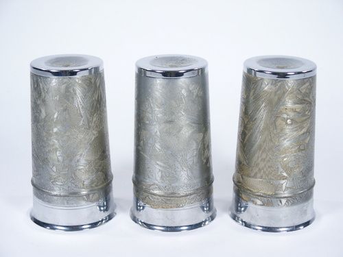 For the cup collector this is a difficult set to find. Cup stands 5 3/16" high with a mouth diameter of 3" and having modernized crystal finish. Also includes the Abbott directions. No balls supplied. Condition fine. | |