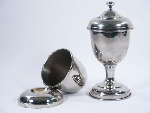 This is a beautiful vase with all its parts being the vase, lid and inner load chamber with friction fit take away lid. Made of nickeled brass and standing 10 3/4" high. After taking the vase and scooping into a box of bran dumping it back in a few times as if not getting quite the right amount the magician finally comes up with what he feels appropriate and covers it with the lid. Upon opening the lid it is found to contain a live guinea pig! This one in quite wonderful condition and these seldom come available. Condition very fine. | |