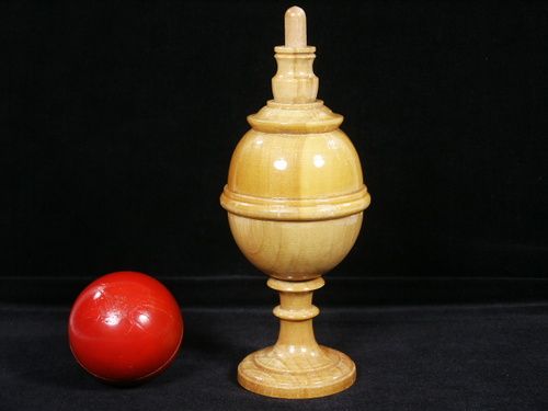 This vintage turned wood vase is mechanical to allow for the reproduction of the previously vanished red ball and the size of the ball is 1 3/4". Seldom do you find one in such good condition. | |