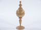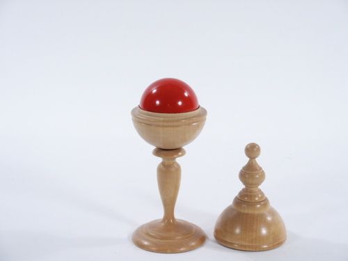 This vase of exquisitely turned wood stands 7 1/4" high and making use of a solid wood red lacquered ball 1 9/16" in diameter. This ball box is a most deceptive mechanical apparatus as a piece displaying the virtuosity of the wood turner's art, it is a Collector's item. After the ball is clearly removed from the vase and vase set aside it is vanished. Going back to the vase with empty hands the lid is removed and vase tipped over into a waiting hand and solid ball rolls out! A piece to treasure and admire. Includes instructions. Condition First Rate Collector's. | |