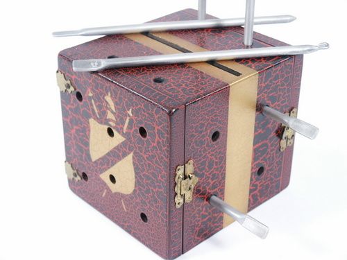 The impossible is achieved when with skewers still in place others are pushed through the box from back to front! A ribbon (not included) is threaded through and there are skewers and ribbon each direction through the box leaving no apparent place for the glass to remain solid. Even with all the impalements the glass is removed and shown to be unharmed!