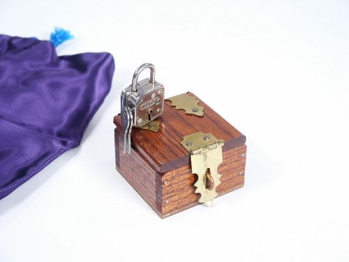 A Lippincott box which is fitted nicely along with a small padlock and drawstring satin bag which plays part of the mystery in a routine given by Edwin that is included. Includes 5 pages of instruction. Condition very fine.