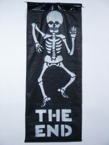 This is a 35" long banner and 14" wand length with skeleton design which when rolled tightly gives the appearance of a magic wand. The white finish for the tips section is flaking away otherwise very good condition.