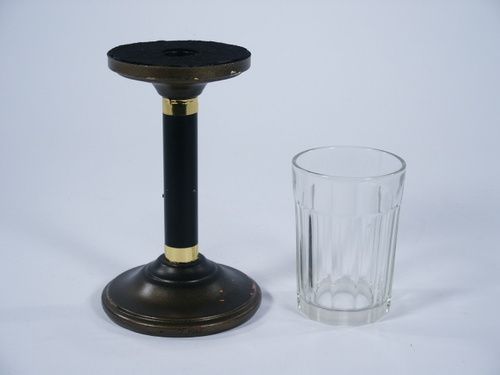 The special gimmick pedestal is made of metal and comes with a heavy fluted glass that is bottomless. With this comes instructions for many more effects than ever before imagined beyond that of the vanish and reappearance of a silk. Minor paint absence on pedestal. Condition very fine. | |