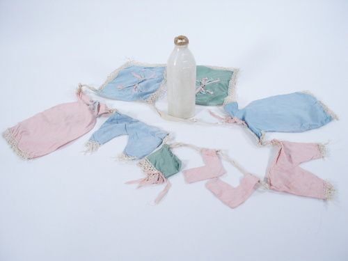 From Ireland's Magic in Chicago. Imagine opening a spectator's coat and removing a string of baby clothes with the climax being a baby bottle! Includes instructions illustrated by Tarbell. Some of the baby clothes even have lace trim. Condition rubber nipple has hardened and crumbled away otherwise fine.